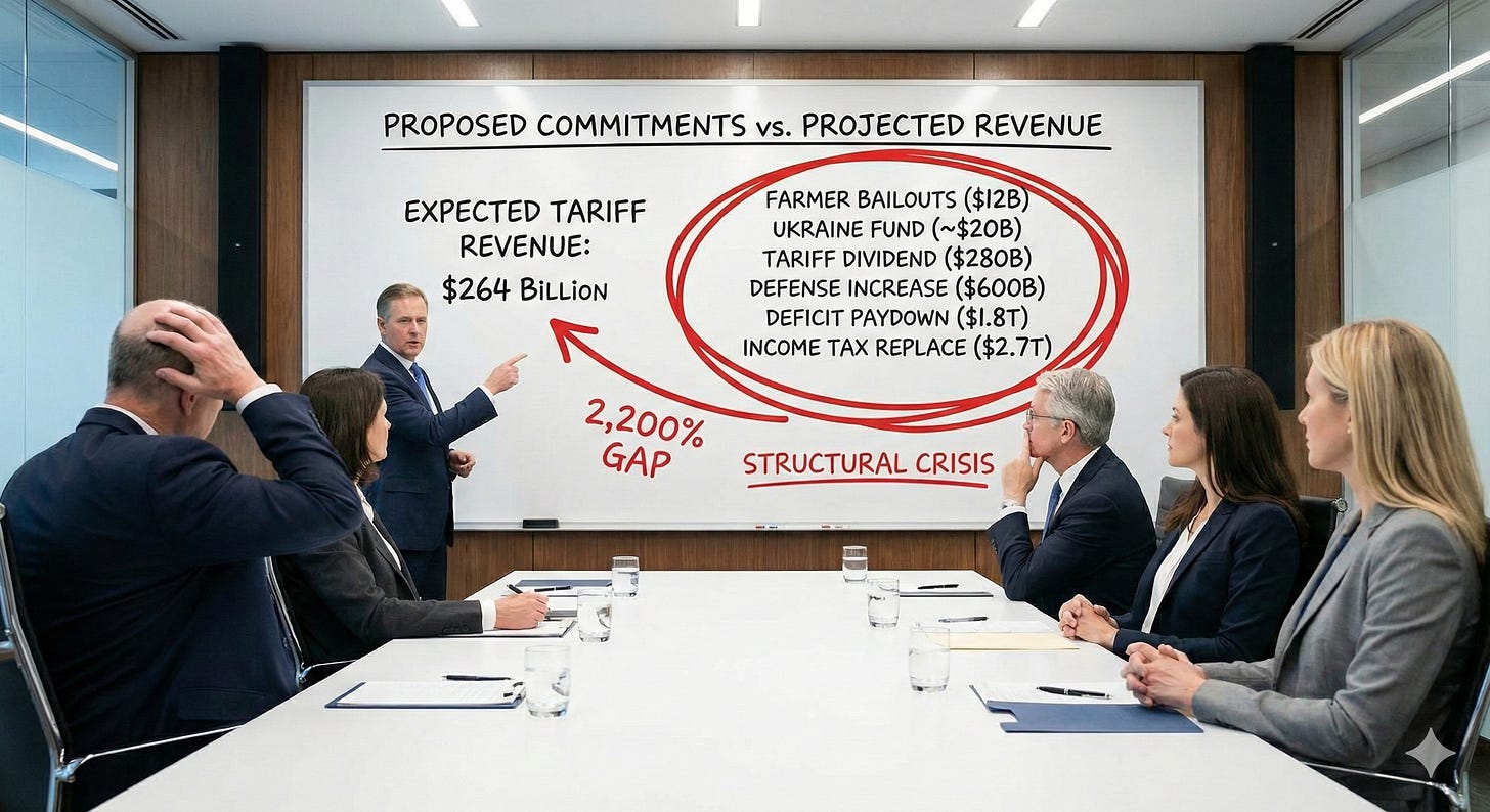You see that the farmer bailout and the tariff dividend are competing for the same dollars. You see that “paying off the deficit” and “replacing the income tax” require the same revenue stream multiple times over. You see that the sovereign wealth fund and the Ukraine victory fund and the dream military are all drawing from a well that’s already dry.
